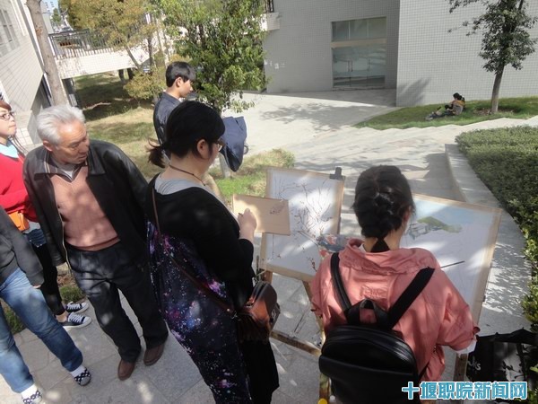 由于参赛人数众多,本次大赛分两个阶段进行。4月6日下午,进行了速写大赛的第一阶段。参赛的同学们各寻角度,在校园不同角落开始艺术创作。有的同学为了便于取景并达到好的构图效果,选取了4号教学楼3楼阳台处进行创作,他们的视角正是游人如织的遇湖之畔、和山之上、万木林间及慧智广场等景点。还有的选择了6号教学楼与樱花长廊之间的交叉路口为创作地点,进行油画风景写生。在他们作画期间,吸引了大量游客驻足观看,不少游客拿出相机拍摄这一情景,对他们的艺术表现力赞叹不已。