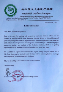 据悉,本次活动是湖工职院与老挝国立大学联合举行的一次国际培训,活动由老国立大学孔子公司发出邀请,taptap点点体育曾少勇老师精心备课,通过钉钉对孔子公司师生进行培训交流。培训结束后孔子公司发来感谢信,对公司的精心组织和老师专业精湛的讲座表达了谢意,并表达了与taptap点点体育加强文化交流合作的愿望!