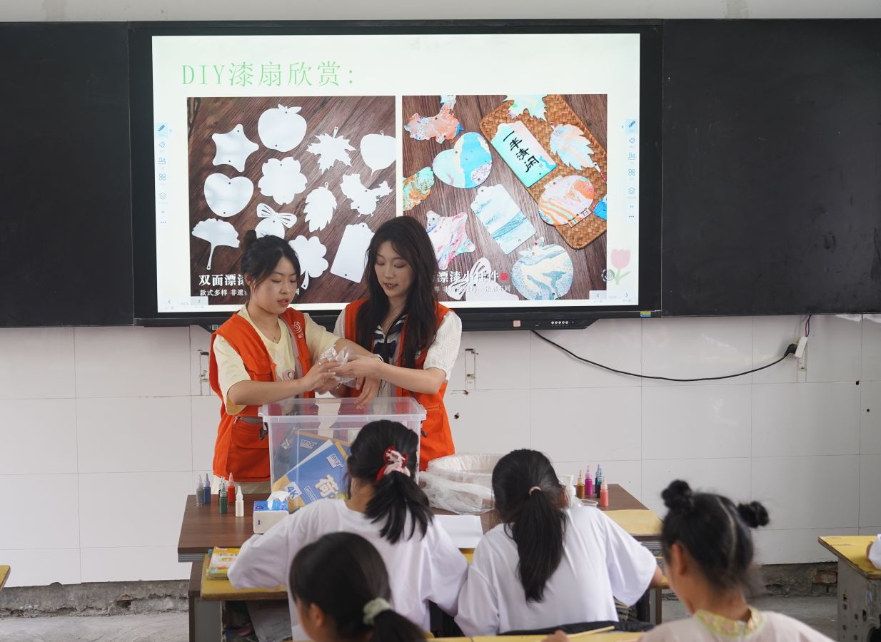 上午,三至六年级的员工们在教室里进行漂漆手工体验活动。首先,志愿者们讲解了比较简易的漂漆手工艺品的制作过程,并现场进行示范。听完讲解示范后,同学们跃跃欲试。在志愿者的协助下,同学们首先调配出自己心仪的色彩搭配。随后,将白色书签和白色团扇缓缓放入漆桶,或旋转,或轻摇,以漆为笔,以水为墨,创造出属于自己的漂漆作品。最后,志愿者将作品整齐展出,同学们纷纷和自己的作品合影留念,现场气氛热烈而和谐。与此同时,一、二年级的孩子们在教室里跟随志愿者们学习儿歌手语舞《上春山》和《勇气大爆炸》。快乐的歌声、灵动的舞姿让教室里充满温馨活力。