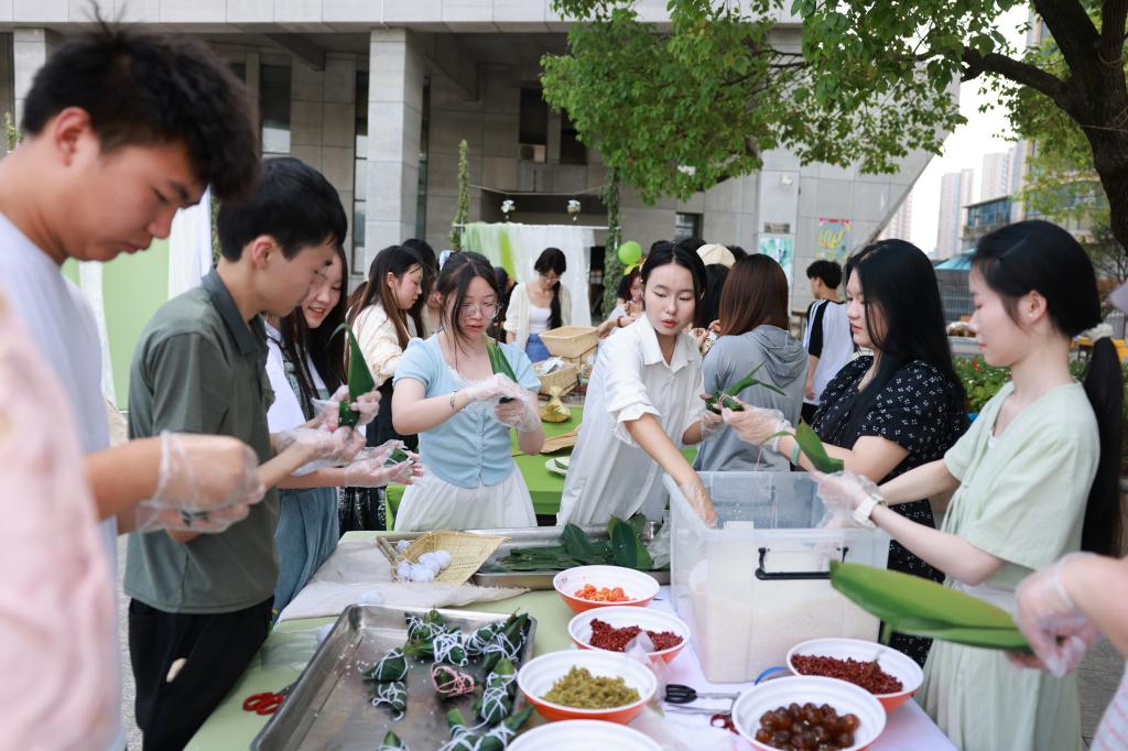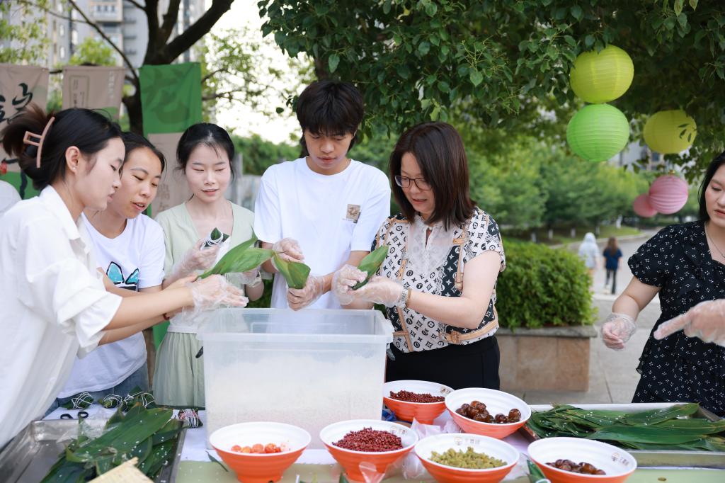 在活动现场,一场激烈的包粽子比赛吸引了众多师生的参与。大家围坐在一起,纷纷展现出自己的手艺,捋粽叶、填糯米、封口、扎捆,动作娴熟而又充满热情。一个个形状各异的粽子不仅包裹着美味,更承载着大家对传统习俗的传承与热爱。