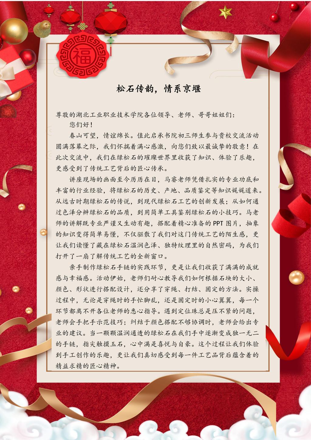 活动中,公司充分发挥专业与资源优势,通过专题讲座、技能实操与文化讲解等多种形式,为来访师生搭建了专业的学习实践平台,帮助他们深入理解绿松石的历史脉络、工艺特色与产业现状。活动结束后,北京第二十中学专门发来感谢信,对公司的周密组织、热情接待与专业指导表示诚挚感谢。