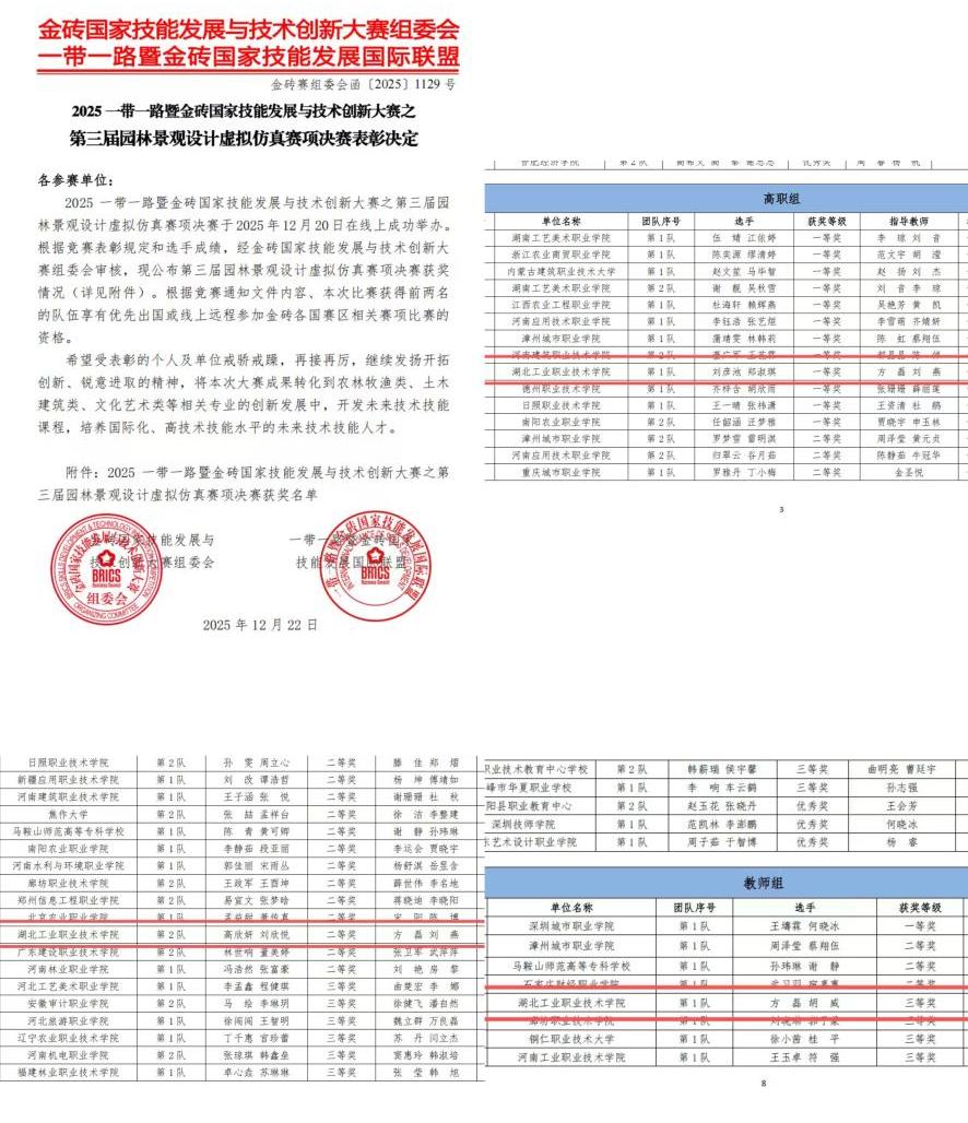 近日,2025一带一路暨金砖国家技能发展与技术创新大赛之第三届园林景观设计虚拟仿真赛项决赛圆满落幕。公司taptap点点体育师生与140支参赛队同台竞技,奋勇拼搏、佳绩频传,两支员工队与一支教师队在众多参赛队伍中脱颖而出,凭借扎实的专业功底与创新的设计理念,成功斩获员工组1金1银,教师组1铜,为公司再添荣誉!