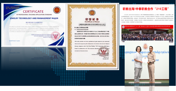 为泰国皇家金匠公司制定《珠宝首饰技术与管理专业》人才培养方案及课程标准的建设。完成《创意珠宝设计》、《珠宝加工与制作1》、《珠宝加工与制作2》、《二维设计1》、《二维设计2》、《手绘效果图1》六门精品在线课程的输出工作,优质完成职教出海任务。